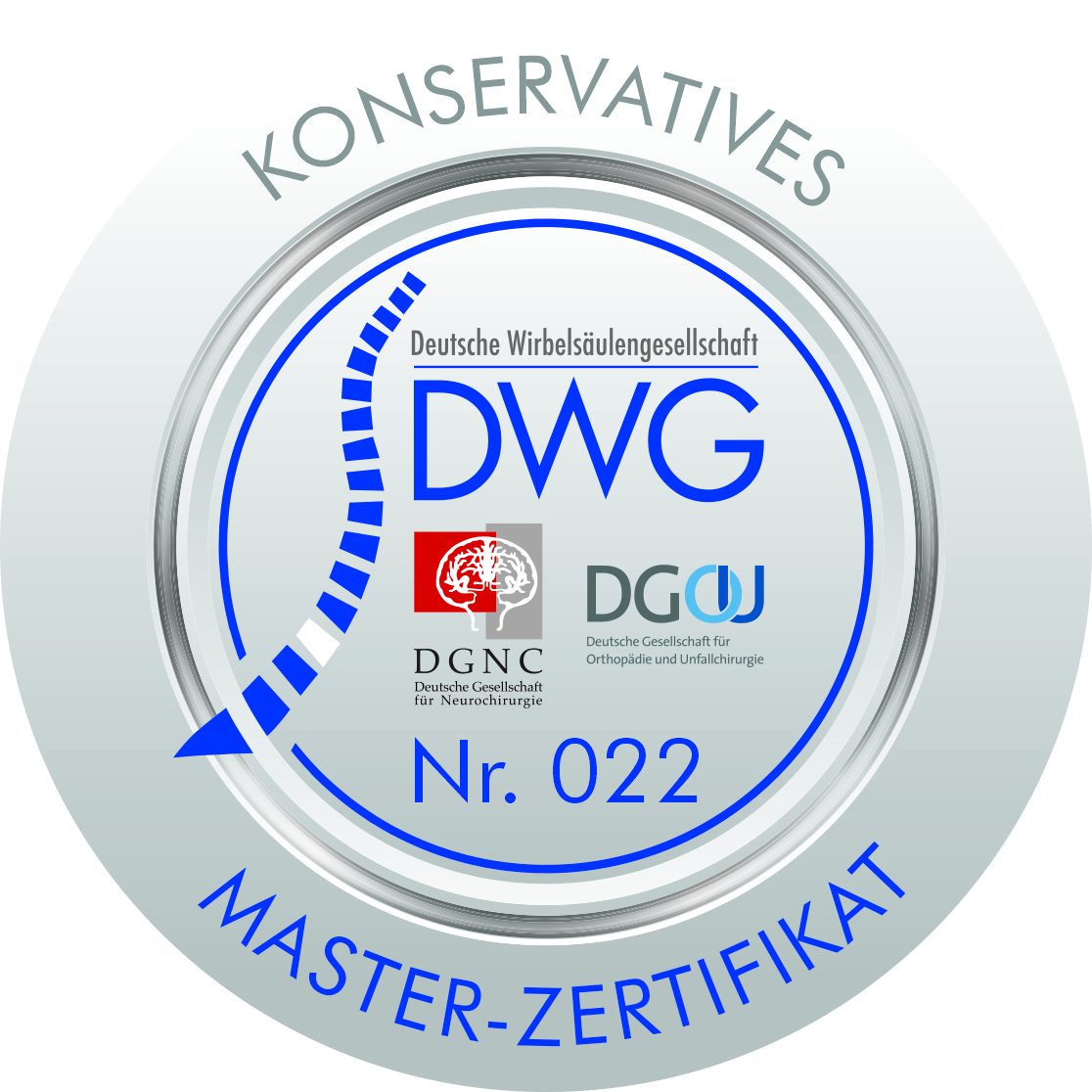 Inhaber des DWG Master-Zertifikats „Konservative Wirbelsäulentherapie“ (Deutsche Wirbelsäulengesellschaft, Nr. 022)